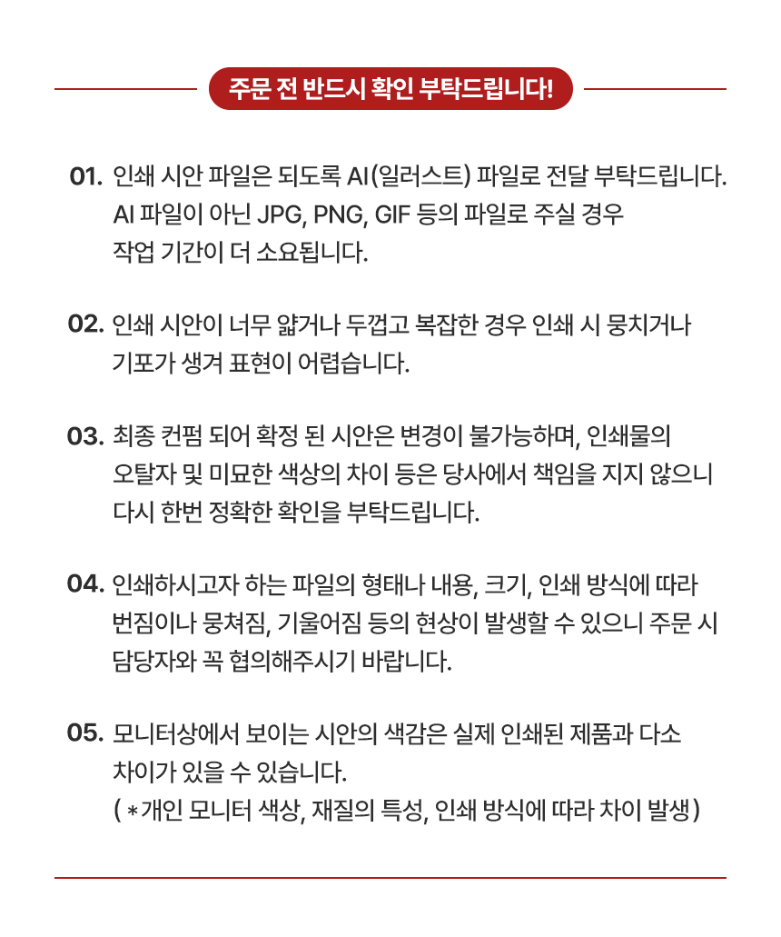 - Àμ⸦ ÇϽô °æ¿ì, ´ç»ç¿¡¼´Â °í°´´ÔÀÌ º¸³»ÁֽŠ¿ø°í ¹× µµ¾ÈÀ» ±âº»À¸·Î ÇÏ¿© Çʸ§À» Á¦ÀÛÇϰí, Á¤È®¼ºÀ» ±âÇϱâ À§ÇØ °í°´´Ô°ú ÀçÈ®ÀÎ ÈÄ ½ÇÁ¦ Àμâ ÀÛ¾÷À» ÇÕ´Ï´Ù. (ÃÖÁ¾ µðÀÚÀÎ ½Ã¾ÈÀÇ À߸øµÈ È®ÀÎÀº Ã¥ÀÓÀÌ ¼ö¹ÝµÇ¹Ç·Î Á¤È®ÇÏ°Ô È®ÀÎÇÏ¿© Áֽñ⠹ٶø´Ï´Ù.)